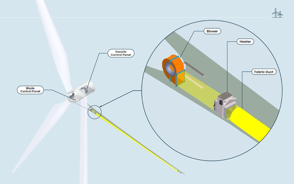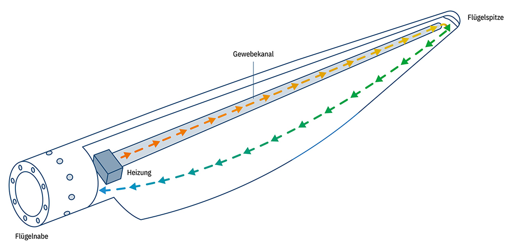We laminate tubular fabric channels into the rotor blades. We then use fans attached to the base of the blade to blow warm air through these channels into the tips of the rotor blades. The heater itself is located centrally in the nacelle. The fans are very powerful and generate a relatively high pressure to circulate the air. This is also the difference to other, similarly operating systems, which work with significantly less power. In this way, we achieve air exchange and bring the warm air to where ice is most likely to form – at the front of the leaves and the tips. Because these are precisely the places that pass through the upper layers of air and trap the crystals.