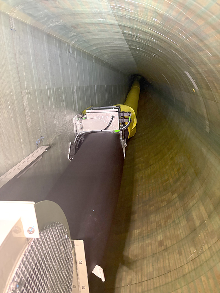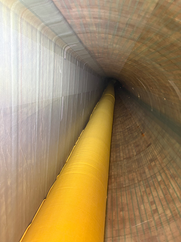 When the wind turbine turns, our fabric ducts are subjected to around twenty times the pressure. We had to carry out extensive material tests for this alone. The material has to be able to withstand the vibrations. It also has to be fire-retardant. We had to find out whether the fabric absorbs moisture and how much of it, because then the weight changes again and with it the forces acting on it. Initially, we supported the fabric channels with fiberglass poles, similar to a tent. The disadvantage was that they became relatively heavy. At the beginning of 2024, we developed a new system in which we installed a bracket in the tip of the blade and tensioned the heating system like a rope. This is lighter and even easier to install. The rotation presses the glued-in holding point, where the rope is tensioned, into the tip and fixes the system. The current system consists only of fabric, which weighs around ten kilograms.